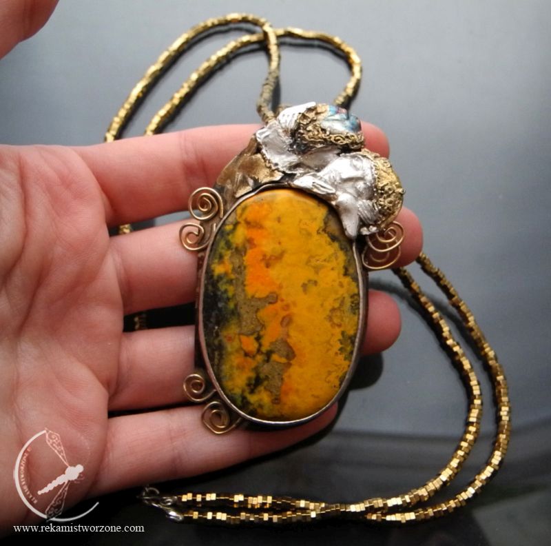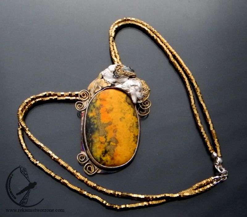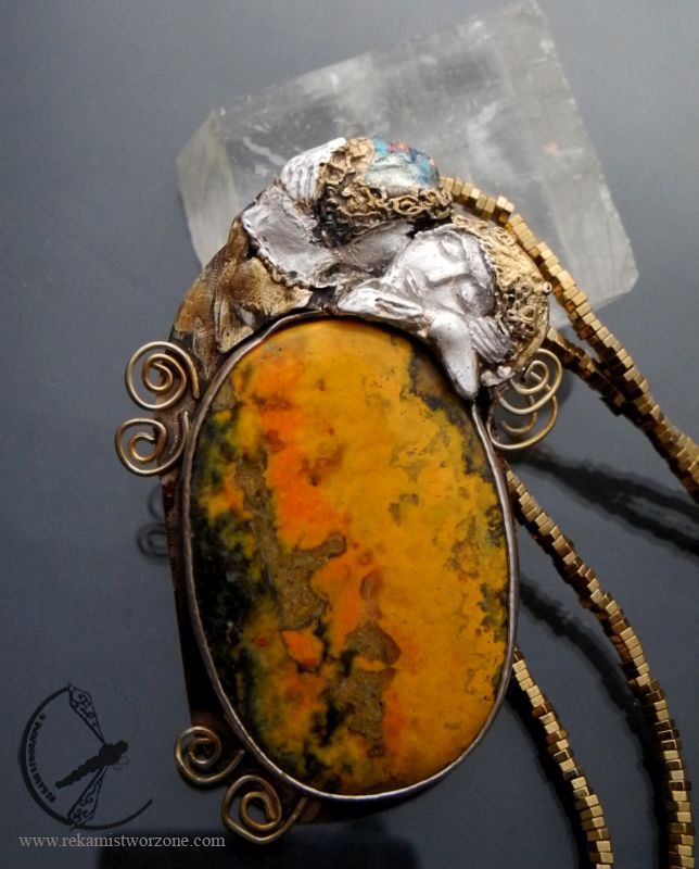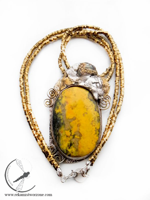 Srebrny naszyjnik z jaspisem trzmielim, inspirowany obrazem Klimta – Pocałunek. Srebro miejscami pozłocone, aby korespondowało z ideą obrazu. Naszyjnik zawieszony na sznurach złotych hematytów.