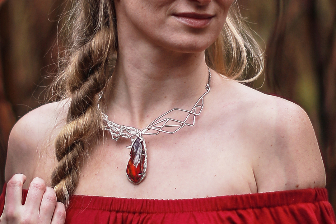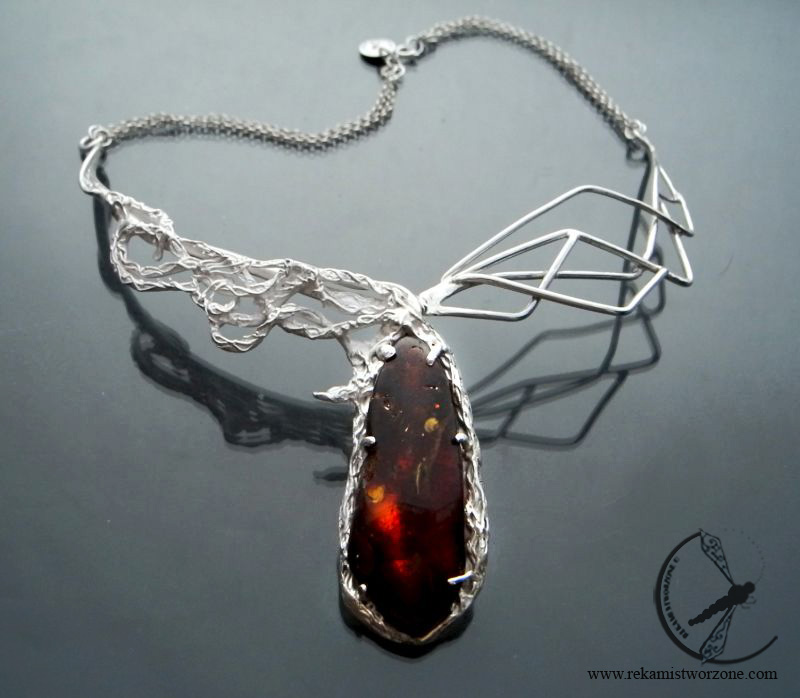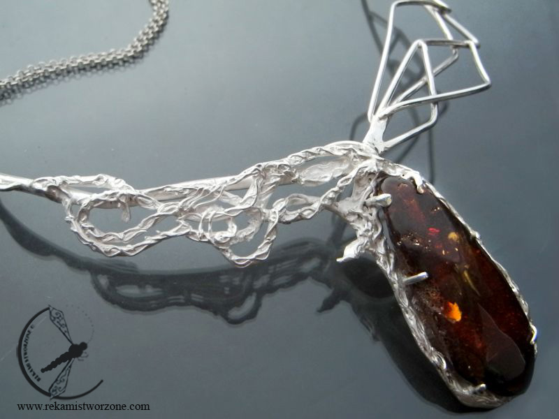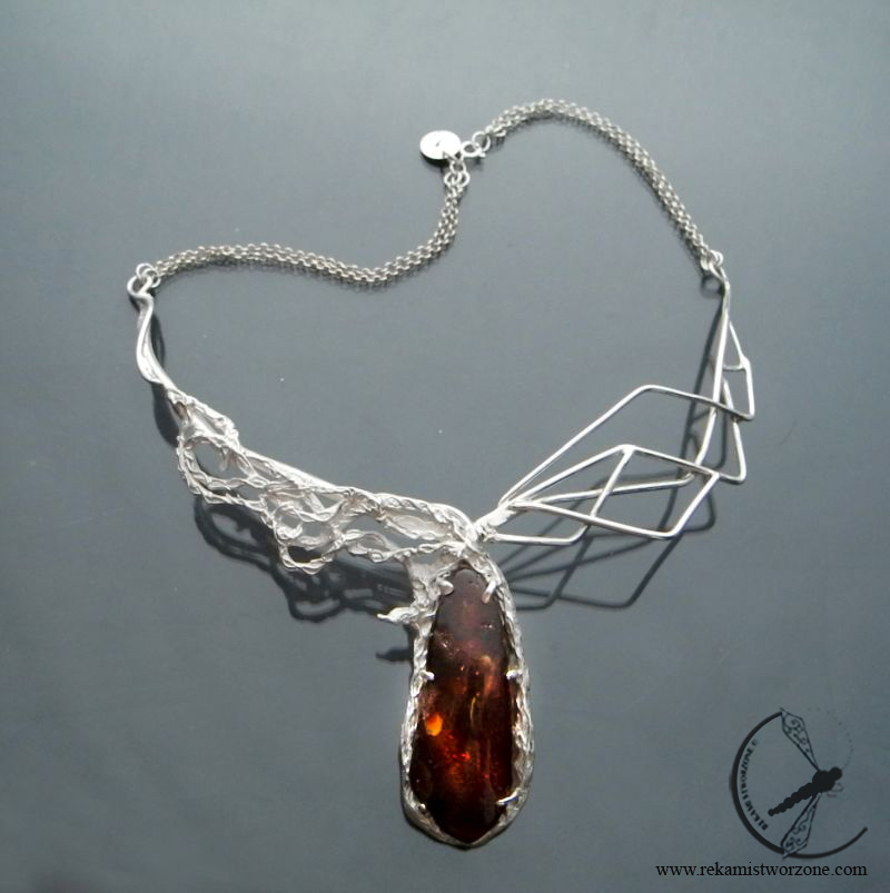 Asymetryczny srebrny naszyjnik z centralnie osadzonym, naturalnym bursztynem o rzadkim wiśniowym kolorze. Jedna połowa naszyjnika jest geometryczna i wypolerowana jak lustro, druga część jest biała i zdobiona roślinnymi ornamentami.