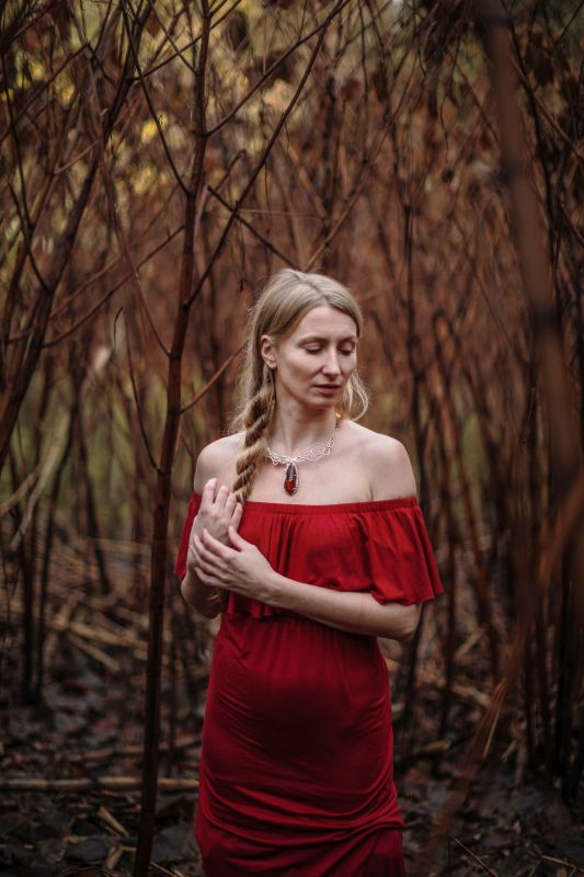 Modelka ma na sobie naszyjnik „Wiśniowy bursztyn”: