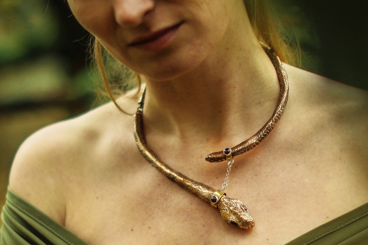 Modelka ma na sobie naszyjnik „Wąż i perski wiersz”