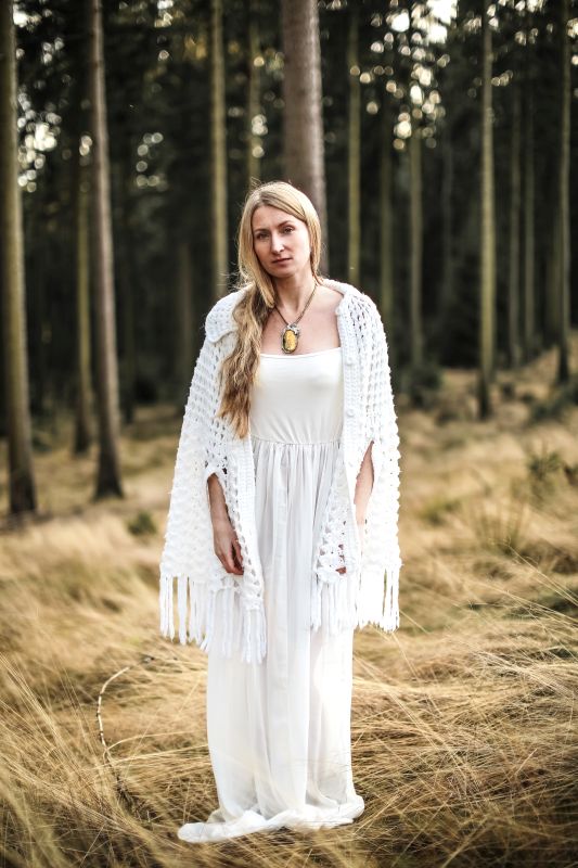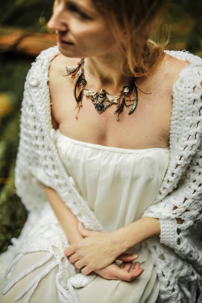 Srebrny naszyjnik zainspirowany postacią bogini-wojowniczki z nordyckiej mitologii. Centralnie ułożona twarz bogini w uskrzydlonym hełmie strzeże zorzy polarnej zamkniętej w labradorycie (wg legendy). Jako element składowy łańcucha naszyjnika wplecione zostały islandzkie runy magiczne: Tarcza Arona, runa spełniająca życzenia, Surtarbrand, oraz znak chroniący przed upiorami (więcej o nich tu: http://blog.rekamistworzone.com/runy-islandzkie ). Chciałam, żeby ta praca miała etniczny charakter, pełen dzikości i wojowniczego ducha. Kompozycję wzbogacają pęki pawich piór, kły z muszli Paua, koraliki z bursztynu, turkusa, jadeitu i labradorytu.