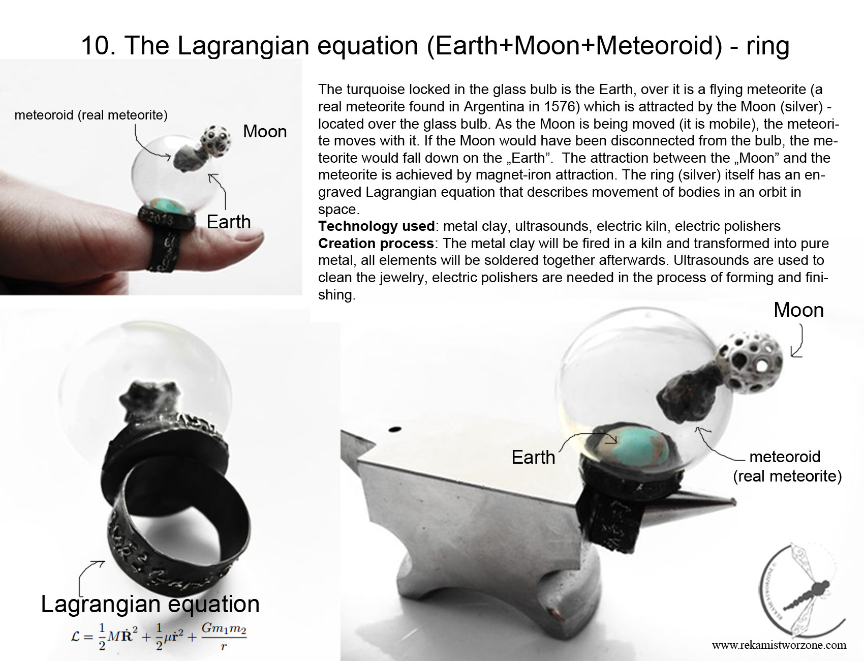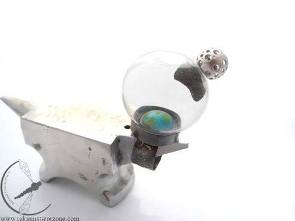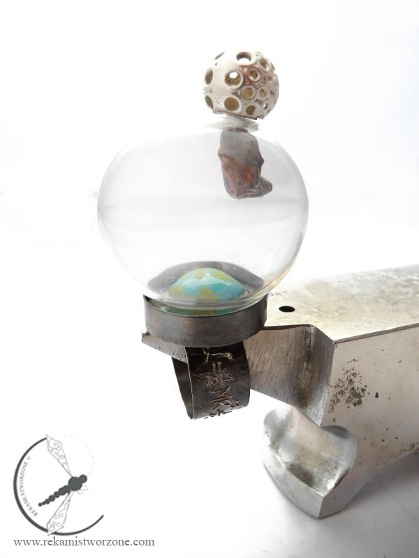 A ring inspired by the meteorite shower, that happened in Russia 15.II 2013. The turquoise locked in the glass bulb is the Earth, over it is a flying meteorite (a real meteorite found in Argentina in 1576) which is attracted by the Moon – located over the glass bulb. As you move the Moon, the meteorite moves with it. When you disconnect the Moon from the bulb, the meteorite will fall down on the Earth! The ring itself has written equation to count the trajectory of the comet.