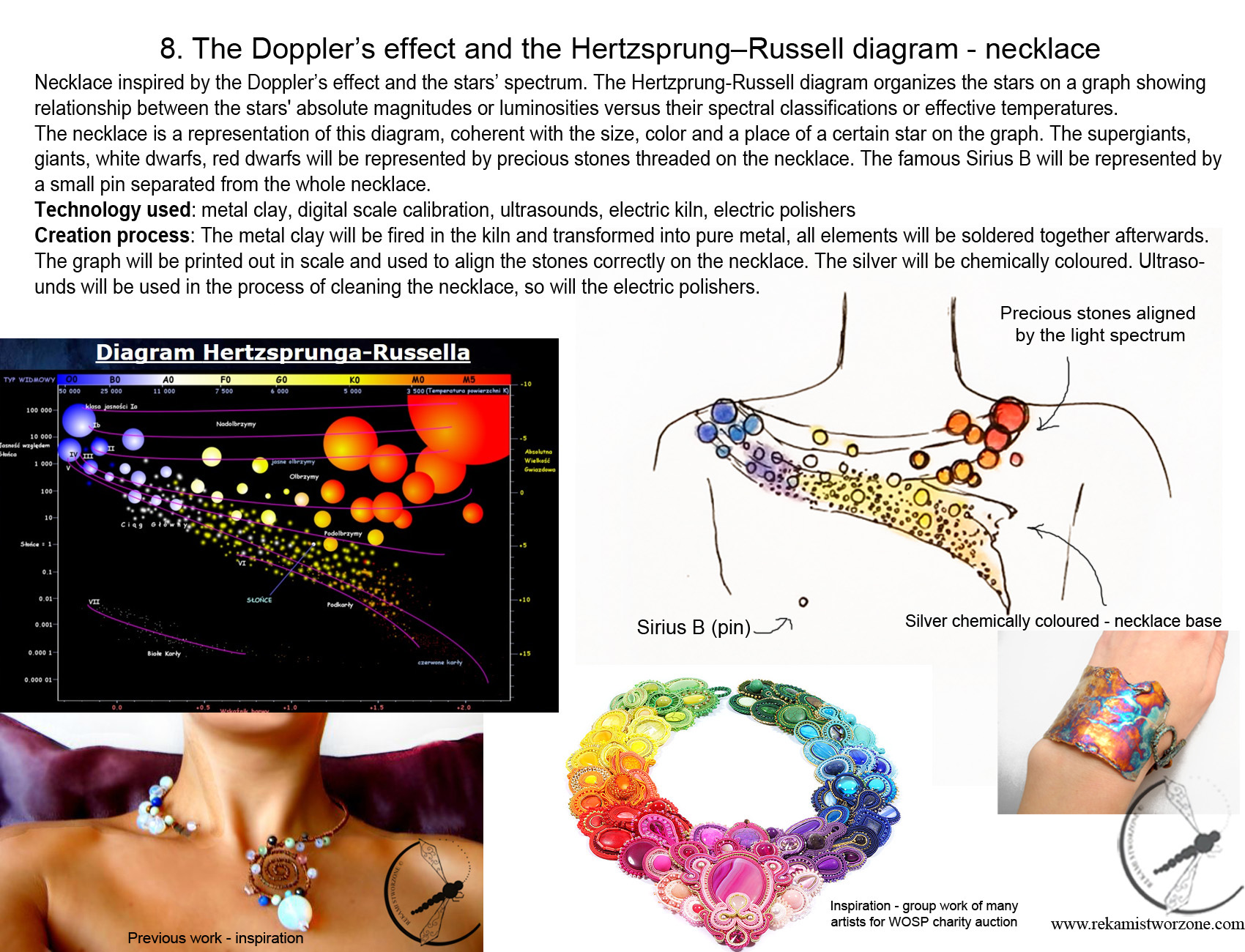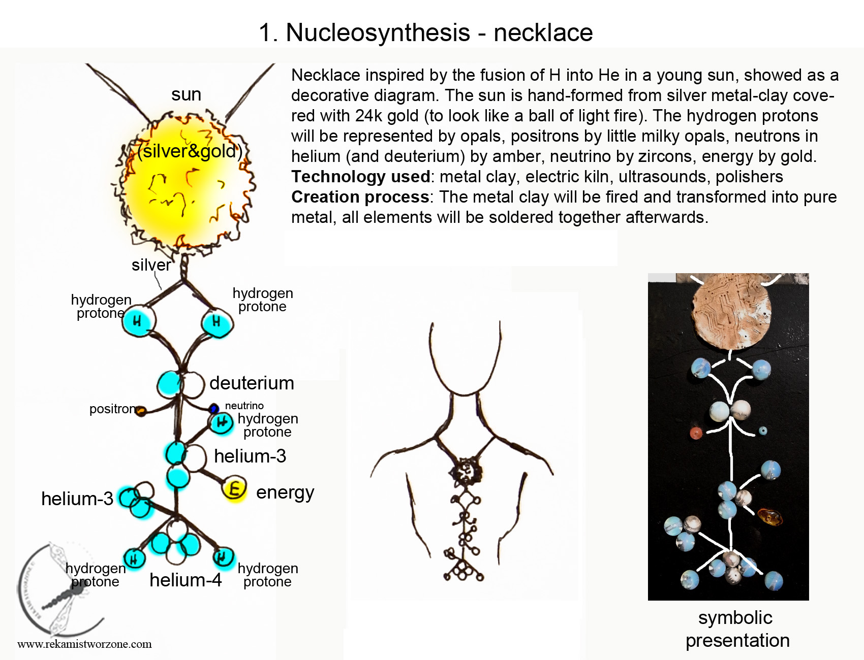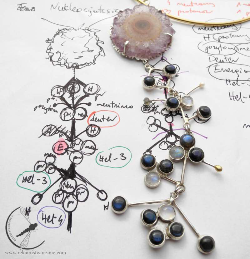 Have you ever wondered why the stars shine? This is a very simple recipe for that (simplyfying the whole matter, of course). The stars burn light elements (Hydrogen) and as a conclusion of that reaction, a heavier element appears (Helium) and energy <3 This is a step-by-step diagram of that process. At the top of the necklace is a STAR (amethyst “sun”). Under the star, there are 2 hydrogen atoms (labradorites). Hydrogen in its simple form is build with a single proton. When those 2 hydrogen atoms connect, they create another form of hydrogene, but with a NEUTRON (moon stone) in the atomic nucleus – deuter. During that process a positron (small labradorite ball) and a neutrino (small pearl) escape. When a deuter and a hydrogen connect, they create a large amount of energy (gold plated sphere), burn and create a single Helium-3 particle. When two Helium-3 particles join, they create a single Helium-4 particle and two free Hydrogen particles. And the whole process starts again. This golden ball is the energy, which makes the sun hot and basically gives life to our planet 🙂