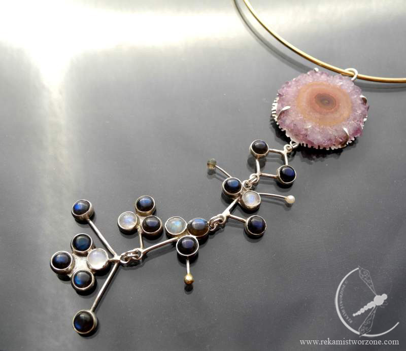 Materials: silver, amethyst, labradorites, moon stones, pearl, 24k gold plating, brass collar