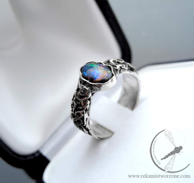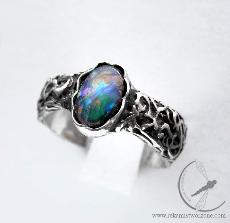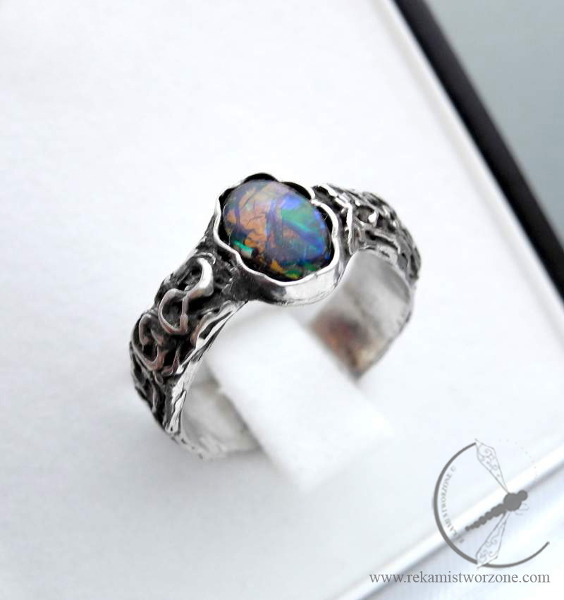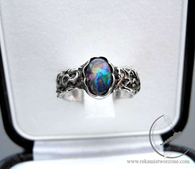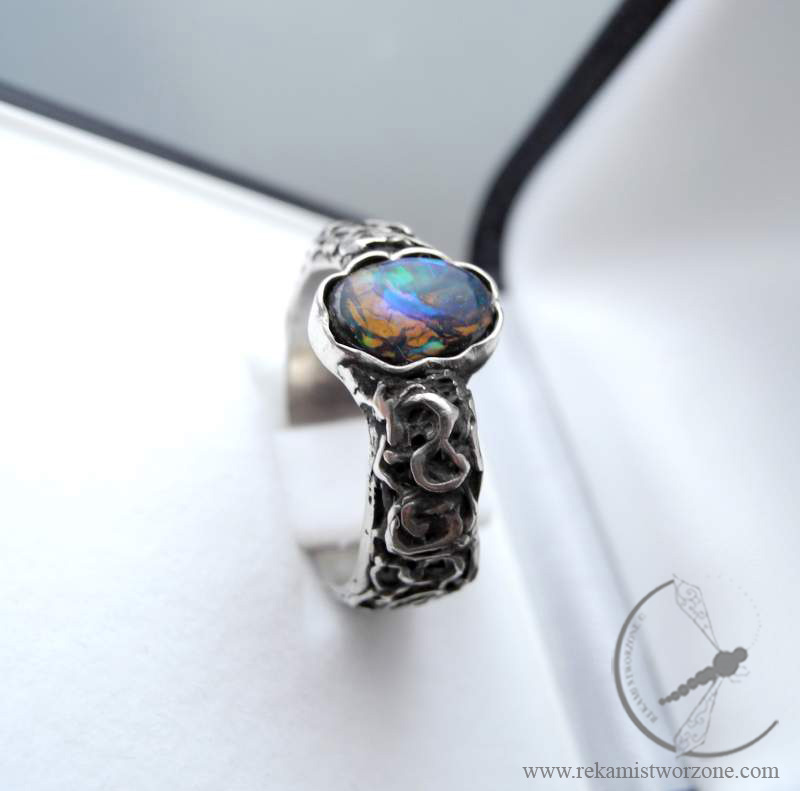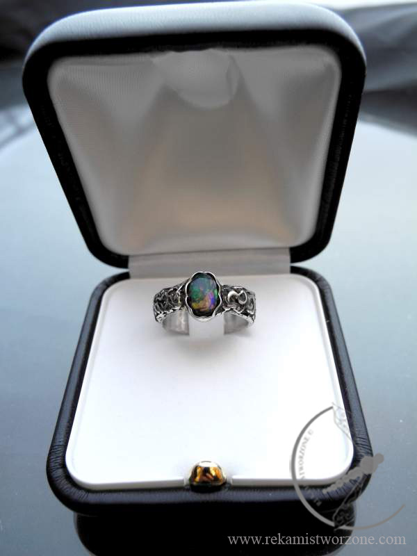 Silver ring with an australian opal with a pink-green-blue flame. It is decorated with an organic-like ornaments.