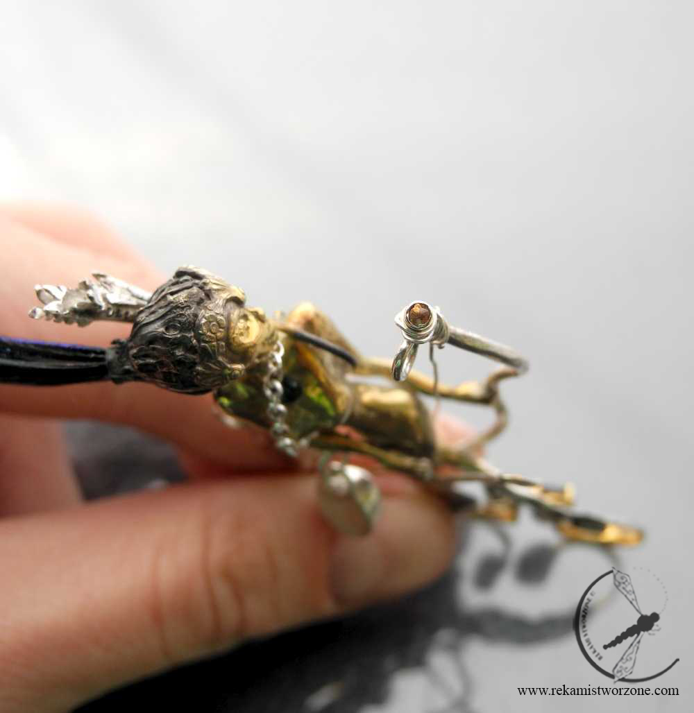 Because she is a hunter, she also has a hunted prey tied to her body with a silver chain – it is a small fly. That fly is 40 mln years old, because it is a precious amber inclusion.