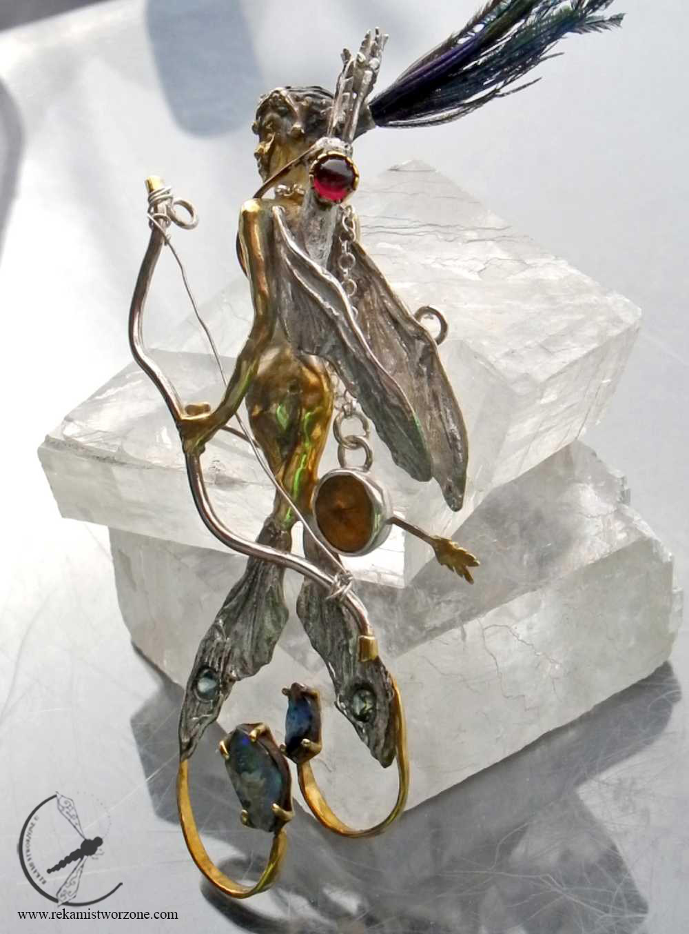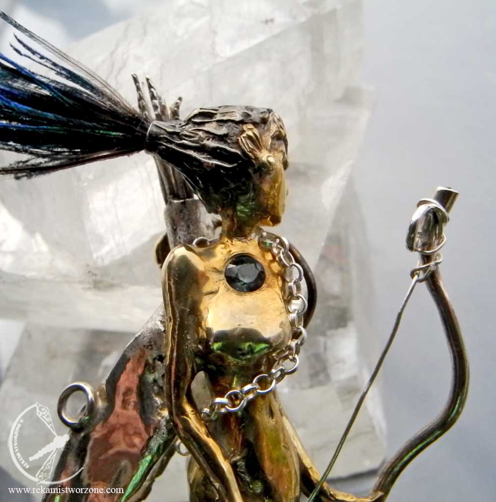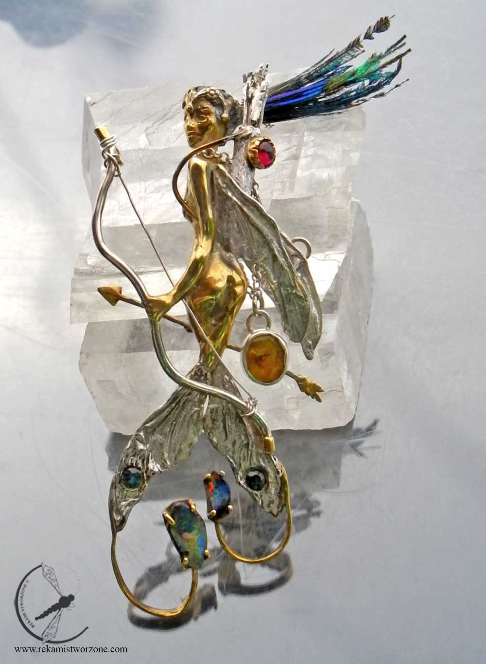 The silver pendant portrays a female-warrior with a bow and an arrow and is inspired by one of the myths of the “Zodiac signs”. One of the “Sagittarius myths” says, that only Chiron was a type of Centaur, that was half human-half horse. The other Centaurs were born of the sun and the clouds. She is one of those, who are connected to the sun and the sky. She has beetle-like wings and a bird-like tail, which make her an airborn creature. Her tail is adorned with blue sapphires and Australian opals. I personally found them in a rock in Australia and cut them for this piece. They have beautiful red sparks of fire, which is very rare in an Australian opal and makes it more valuable. Her heart is made of a blue sapphire. Because she is a warrior, her hair is tied in a ponytail (peacock feathers). She has a quiver full of hand-cut arrows, adorned with a garnet. Her bow is decorated at the top and the bottom with orange sapphires.
