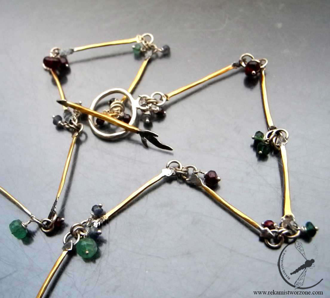 The necklace is made of Sagittarius’ arrows, so is the fastening. It is decorated with Zambian emeralds, sapphires, garnets and iolites.