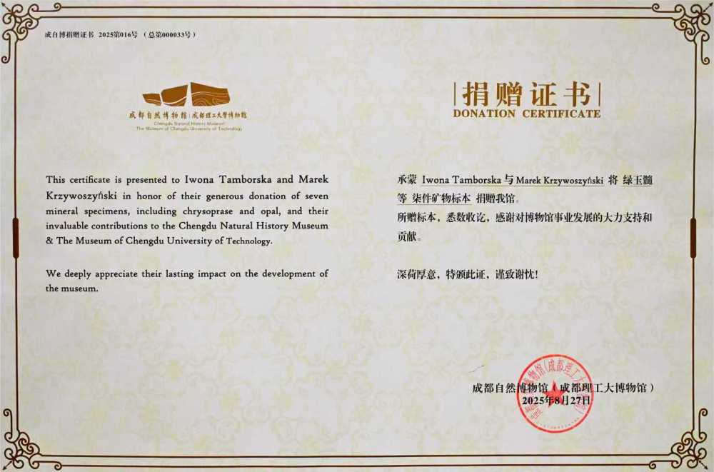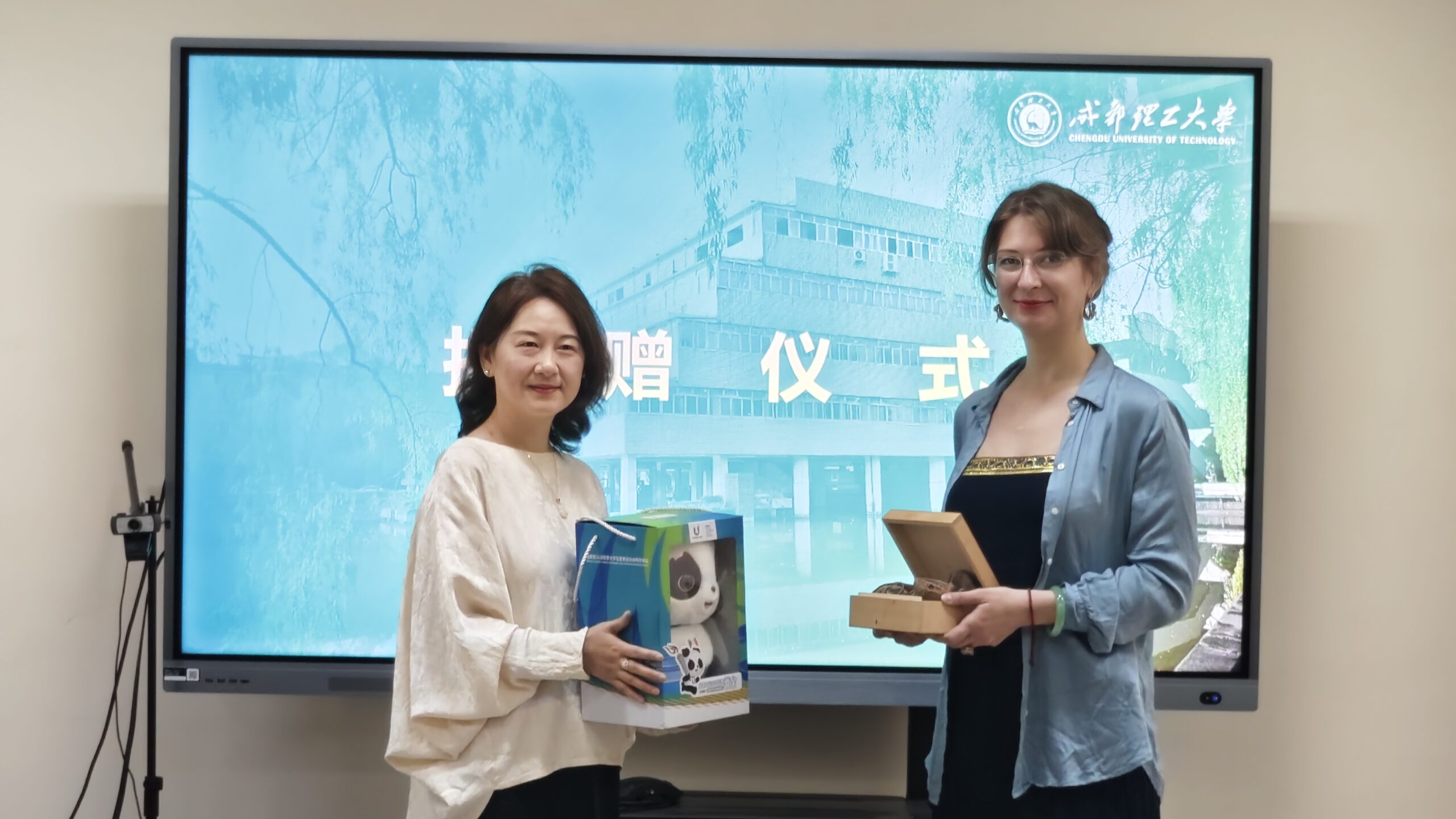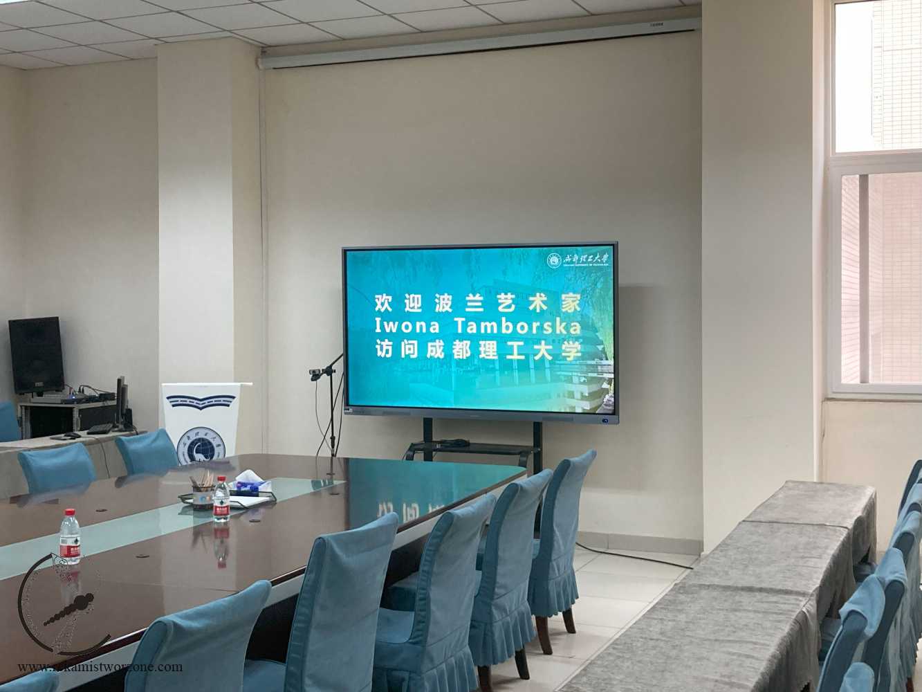Pochwalę się tu nieskromnie, że spotkał mnie wielki honor, za który jestem przeogromnie wdzięczna. Ponieważ zdążyłam tutaj czasem coś pokazać, niektórzy wiedzą, że pasjami zbieram minerały i skamieniałości. Postanowiłam więc sprezentować różne moje, osobiście znalezione, piękne okazy z Polski władzom Uniwersytetu, gdyż słynie on najbardziej z Wydziału Geologii. Zupełnie przypadkowo oni dali mi w prezencie korespondującą, haftowaną na jedwabiu podobiznę szkieletu dinozaura – unikalnego, spektakularnego gatunku, który został znaleziony przez naukowców tego uniwersytetu na terenie Syczuanu. Ja byłam zachwycona podarunkiem, oni moim. Strona Uniwersytetu postanowiła nawet zorganizować ceremonię oficjalnego przekazania moich minerałów dla Muzeum Historii Naturalnej (należącego do Chengdu University of Technology).