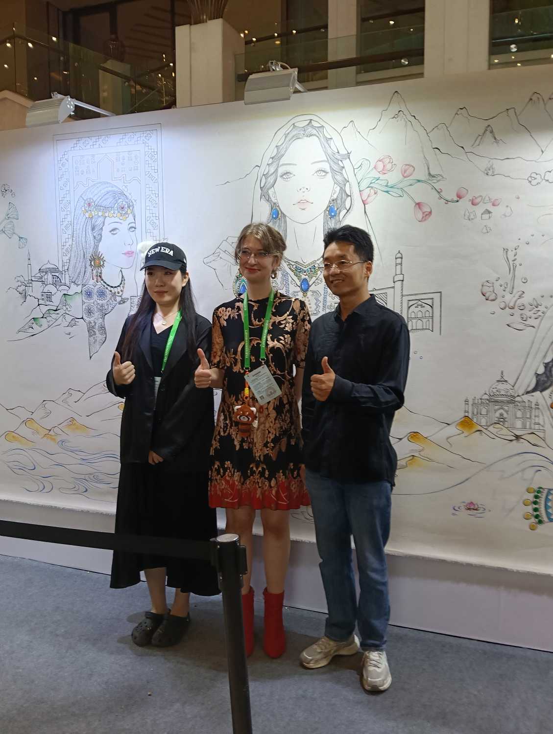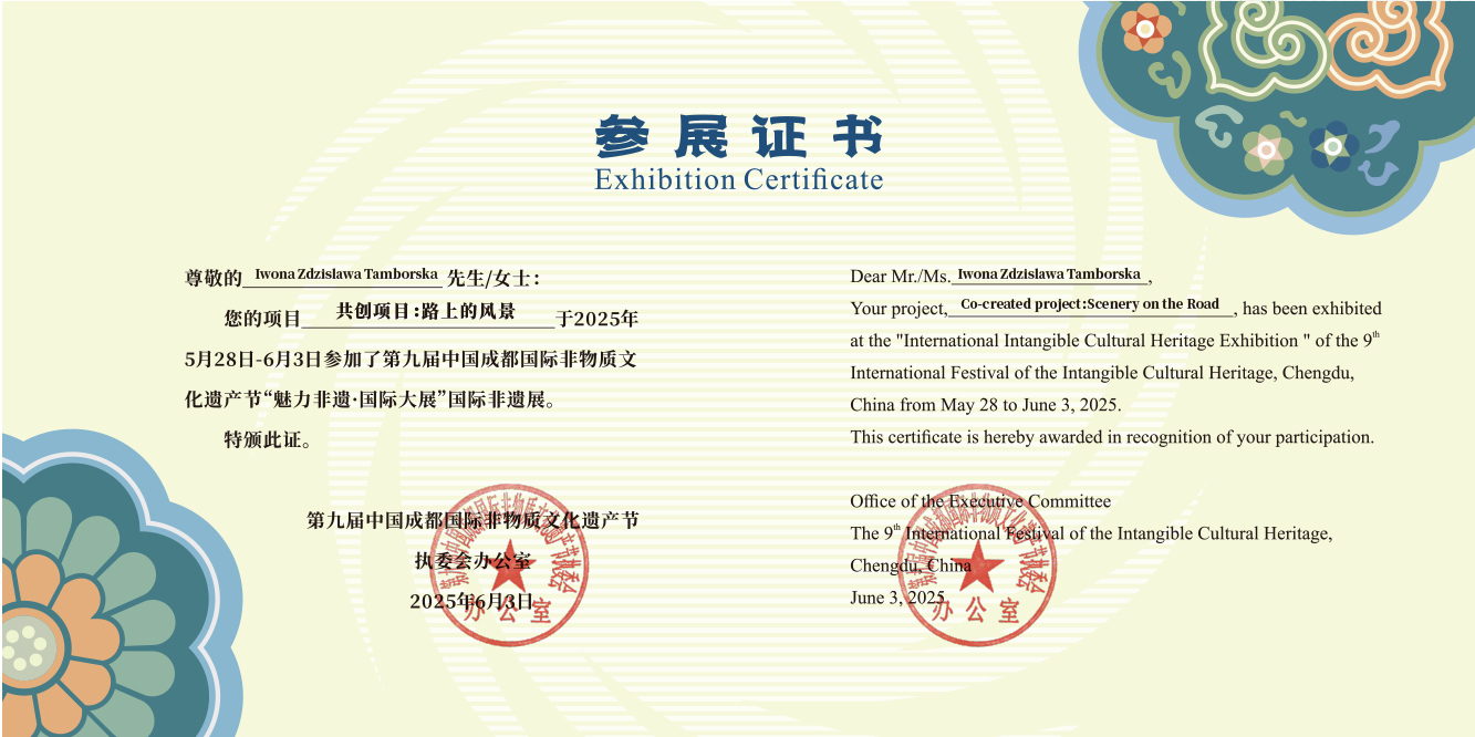 Dotknął mnie zaszczyt bycia zaproszoną przez organizatorów „Festiwalu Niematerialnego Dziedzictwa Kulturowego” w Chengdu do projektu, który realizowałam razem z wydziałem sztuki Chengdu University of Technology. Projektem tym było wspólne malowanie „na żywo” obrazu „Na drodze” przedstawiającego Szlak Jedwabny.