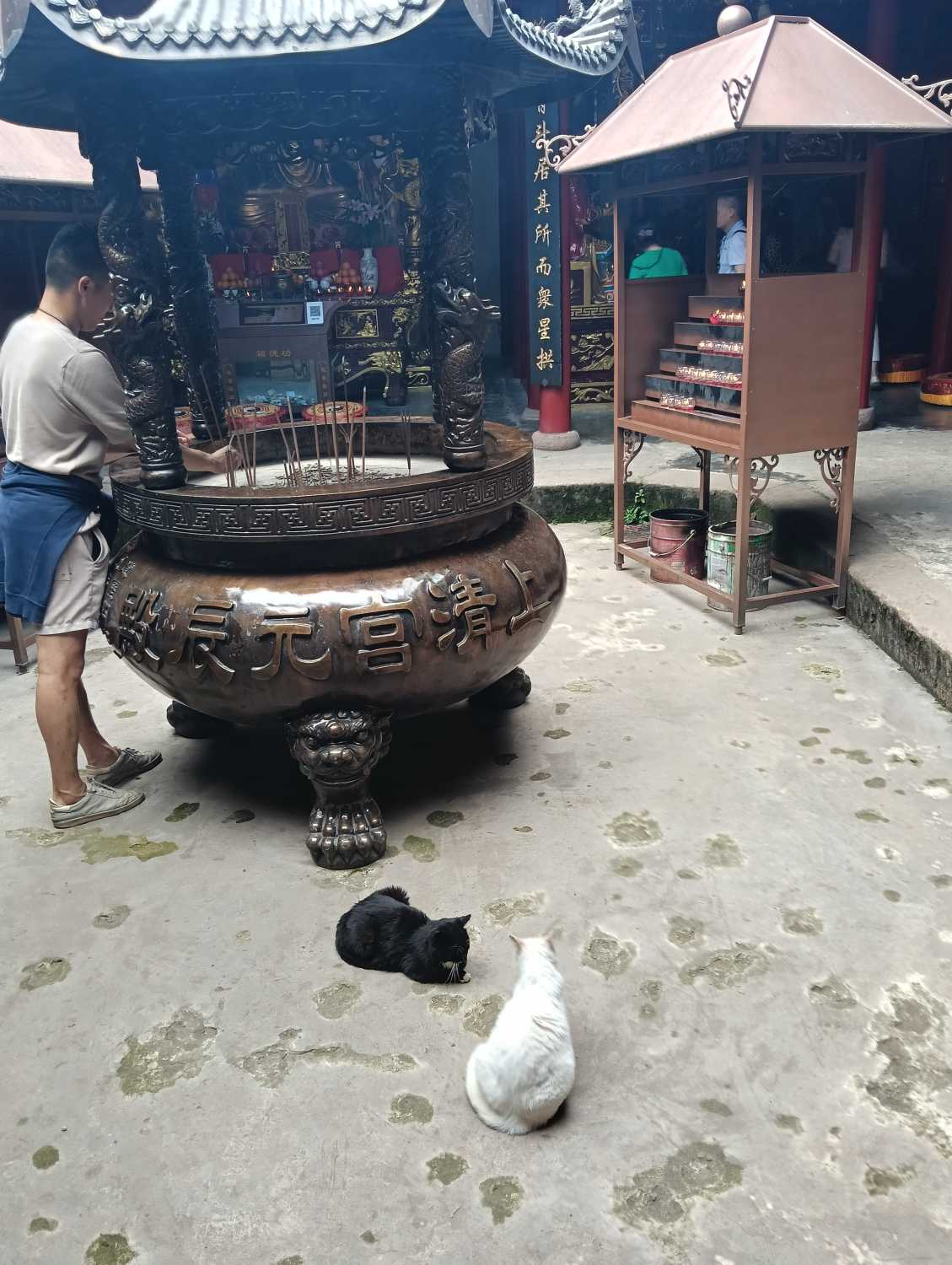 wspinaliśmy się na szczyt góry Qingcheng – miejsca narodzin taoizmu, gdzie spotkałam 2 stare koty: czarnego i białego, niczym ying i yang.