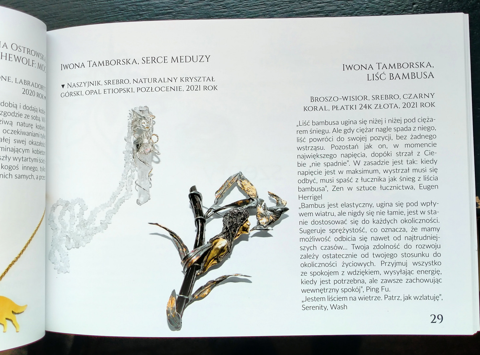 Jest to gałązka bambusa, która w broszy jest zbudowana z czarnego koralu (dostałam go w prezencie, a sama gałązka została wyrzucona na brzeg Australii po jakimś sztormie, wiele lat temu). Jednym z jej liści jest postać kobieca, która uśmiechnięta obserwuje lecące ptaki. Ptaki były niegdyś liśćmi.