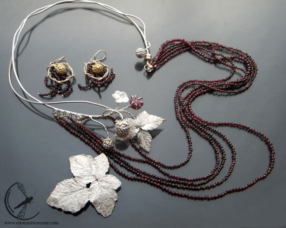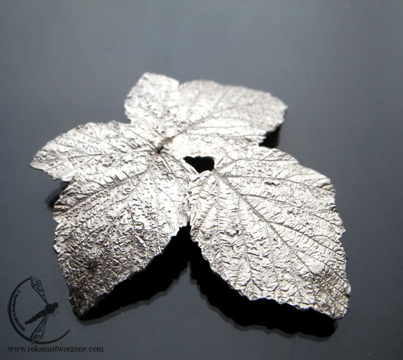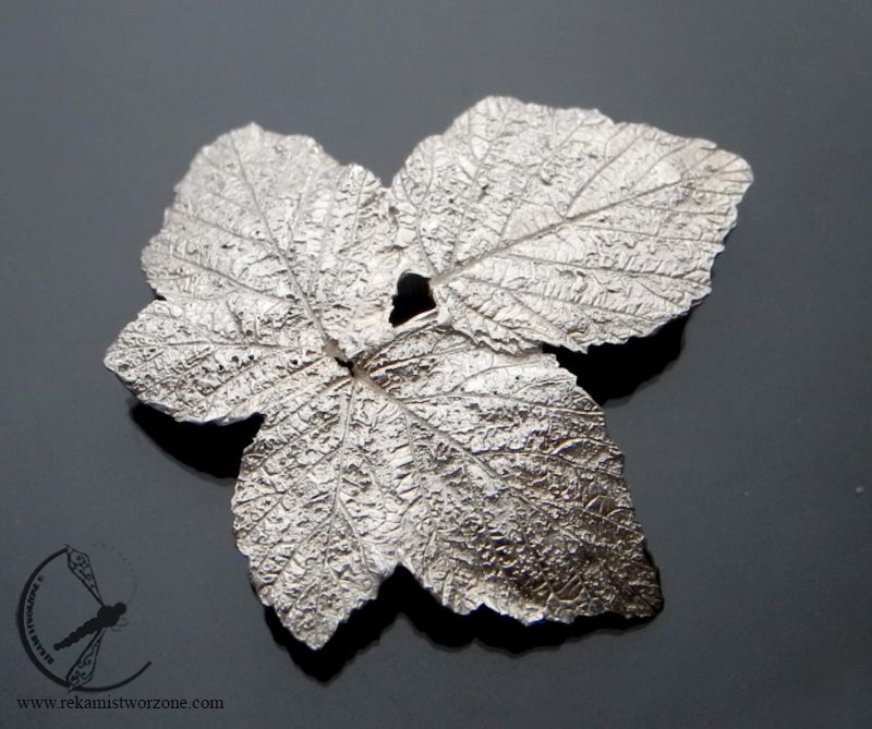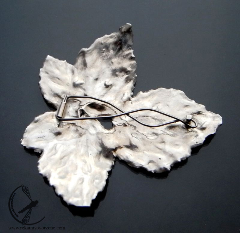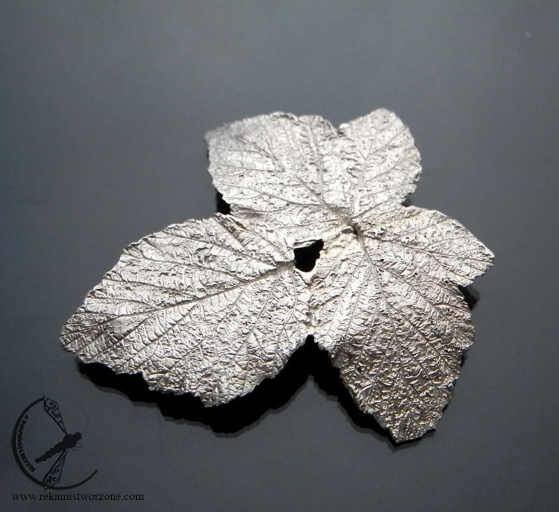 Srebrna klamra do włosów w kształcie dużego liścia malin. Pasuje do zestawu „Maliny”.