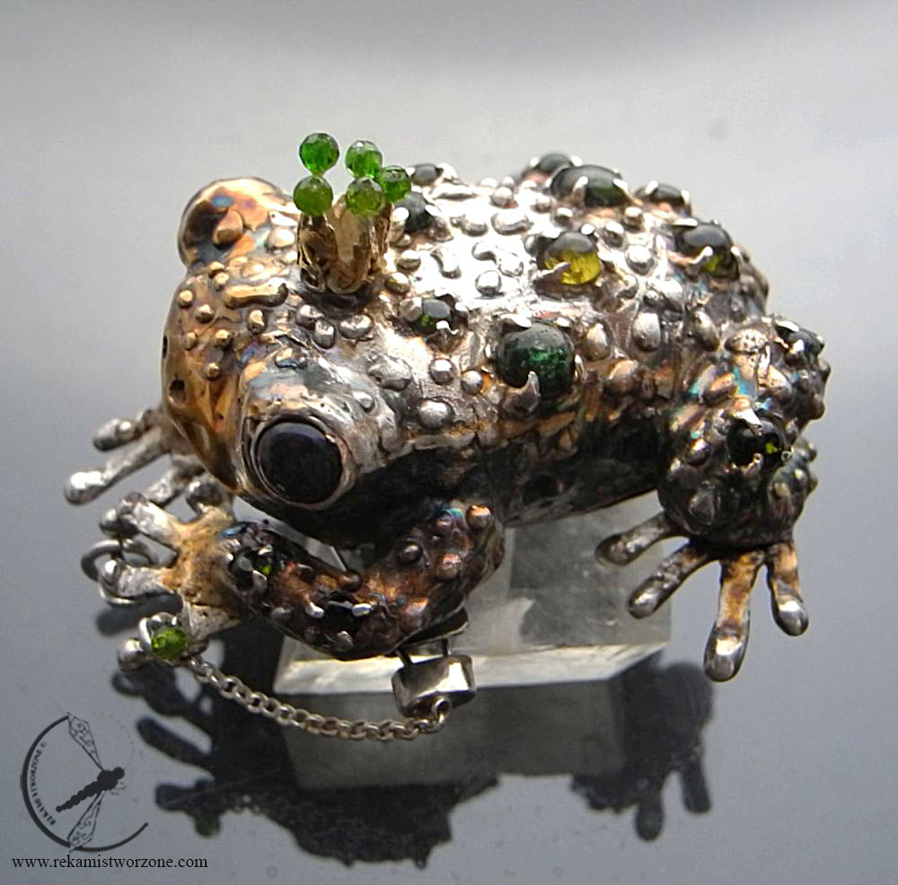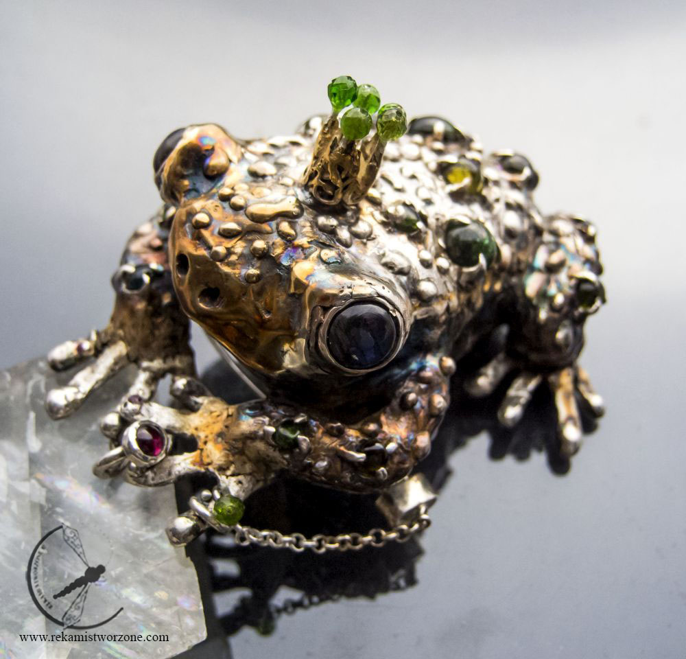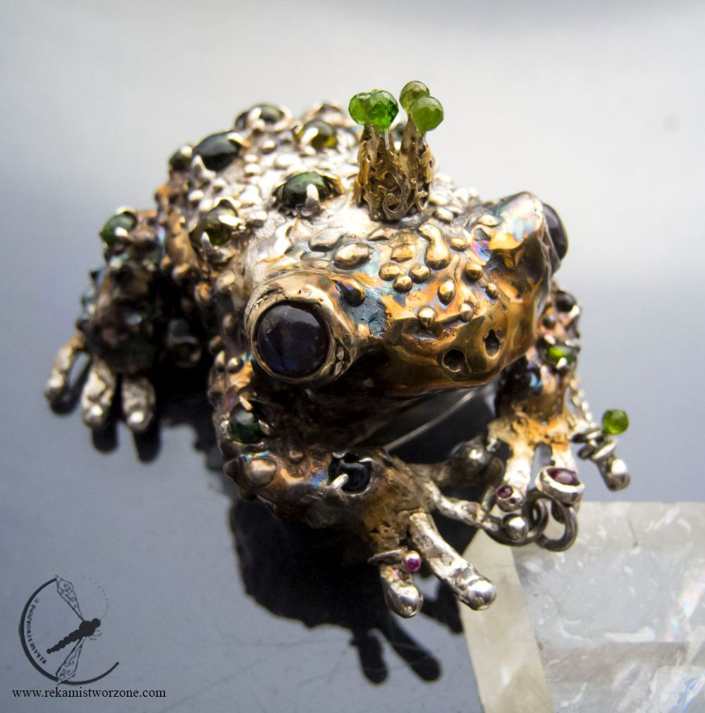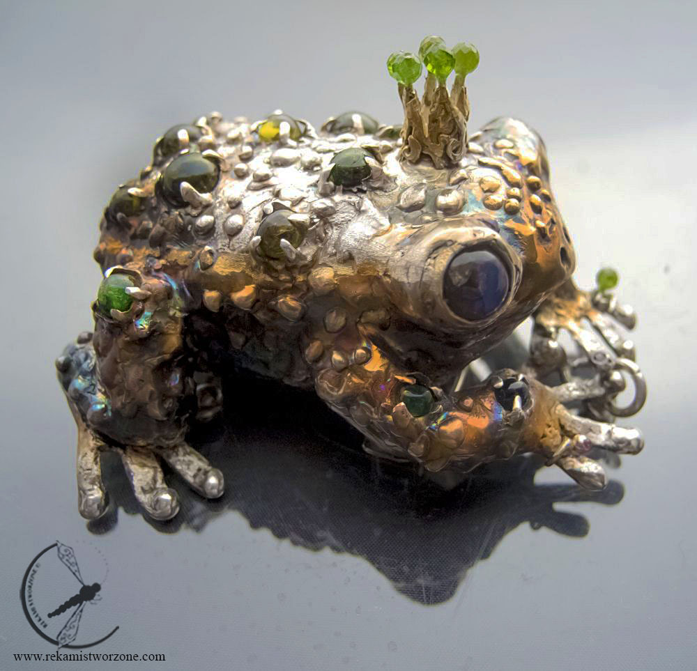Kilka miesięcy temu zostałam poproszona o wykonanie niezwykłej pracy – wielkiej, srebrnej ropuchy o przyjaznej duszyczce i gracji księżniczki. Był to niezwykle trudny projekt – koncepcyjnie wiedziałam, co muszę zrobić. Ale rzeczywistość stawiała ciągle nowe, nieprzewidziane trudności i wymusiła na mnie wymyślenie i zastosowanie wielu trików, dzięki którym ropucha, mimo swojej wielkości, jest jednocześnie dość lekka (bo pusta w środku) ale i wystarczająco odporna, żeby służyć jako pudełeczko. Do tego jest również broszą i wisiorem (i w dodatku postawiona siedzi płasko). Do zawieszenia na szyi służy pierścionek z granatem, który Ropuszka Regina trzyma w łapkach. Oczy ropuszki pełne są żywych błysków i czarodziejskiego spojrzenia dzięki osadzieniu w nich czarnych labradorytów. Na grzbiecie osadzone są butelkowo-zielone turmaliny (14) w roli ropuszych guzów. Na głowie ma pozłacaną koronę zdobioną diopsydami. Na palcu ma pierścionek z diopsydem, a w dwóch pazurkach ma osadzone rubiny. Plecy, łapki i podgardle są diamentowane, a sama ropszuka jest barwiona tonalnie.