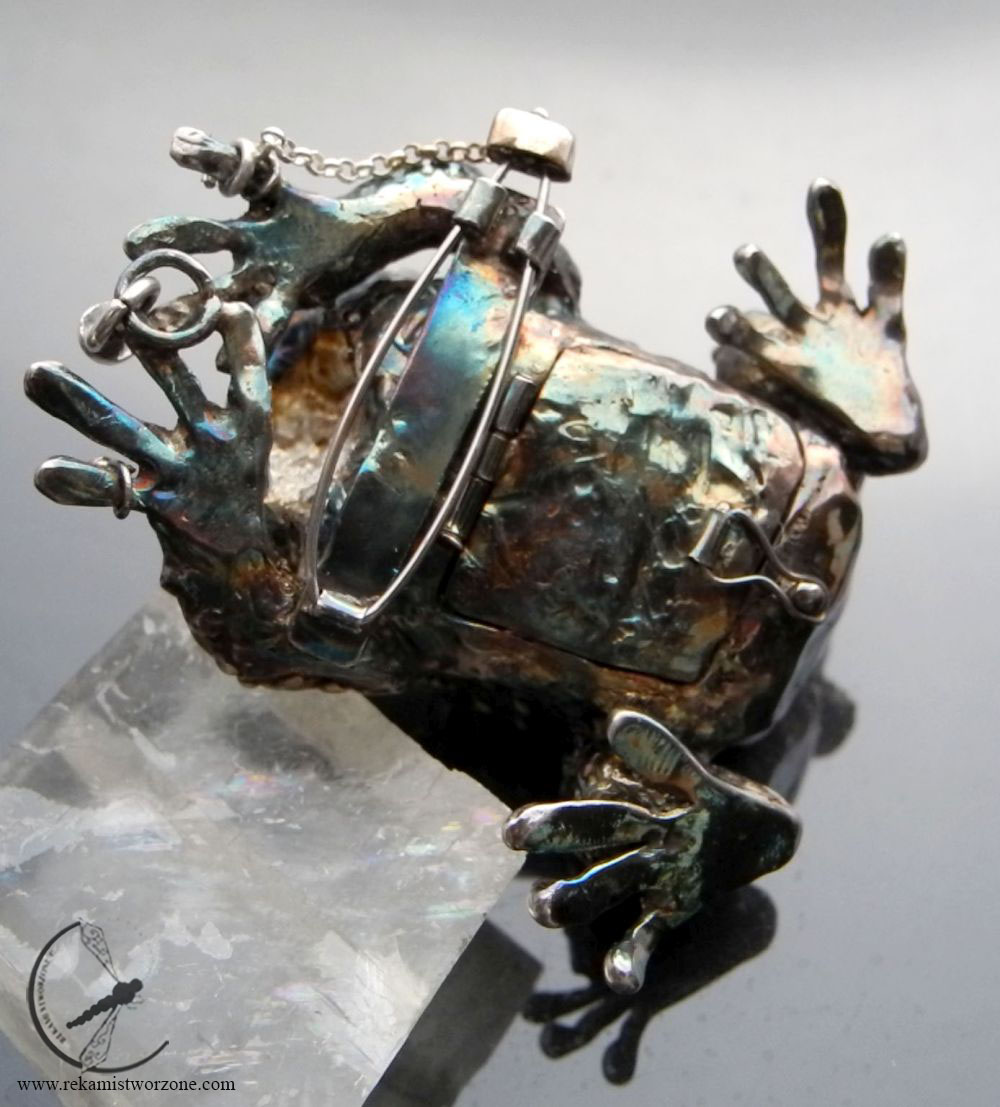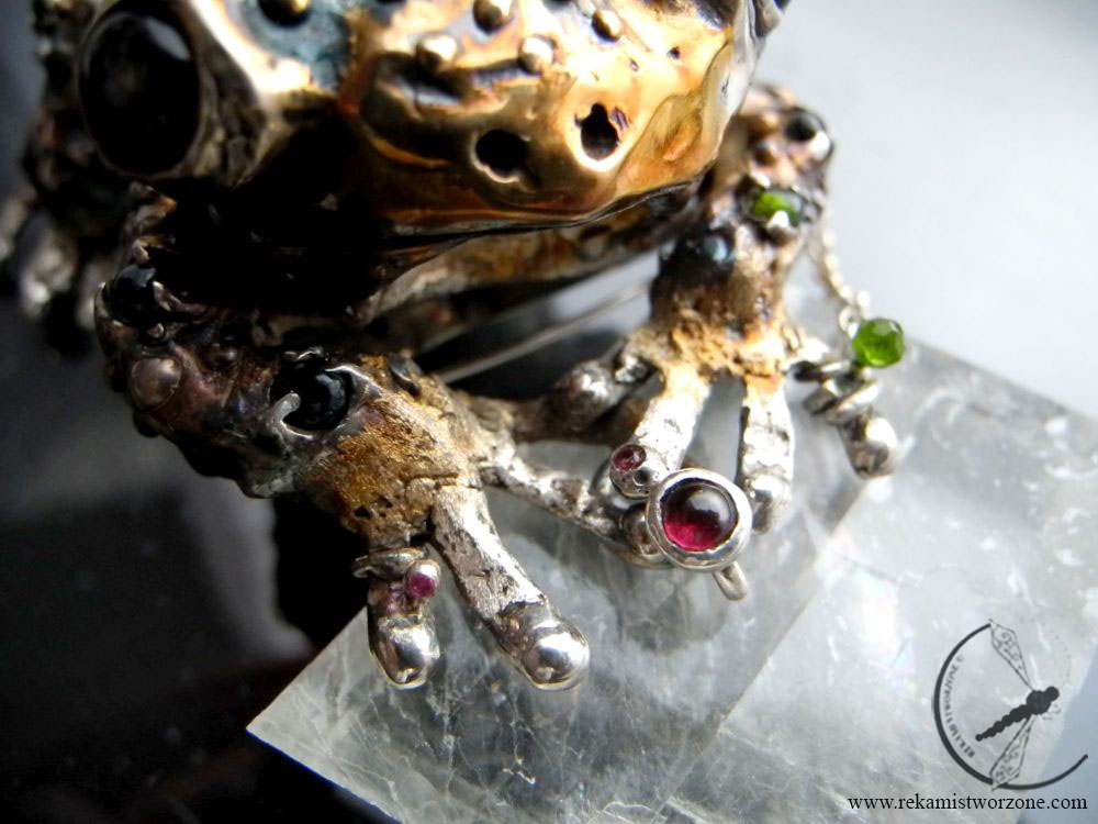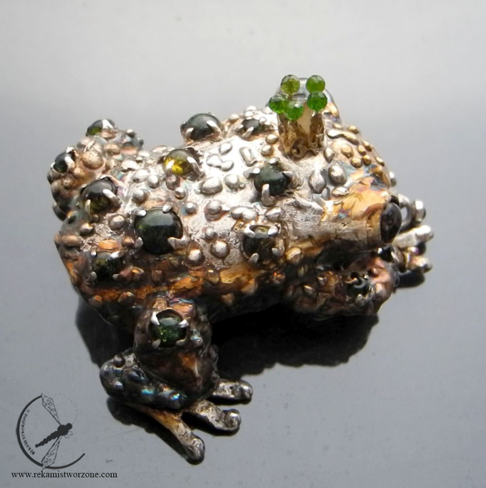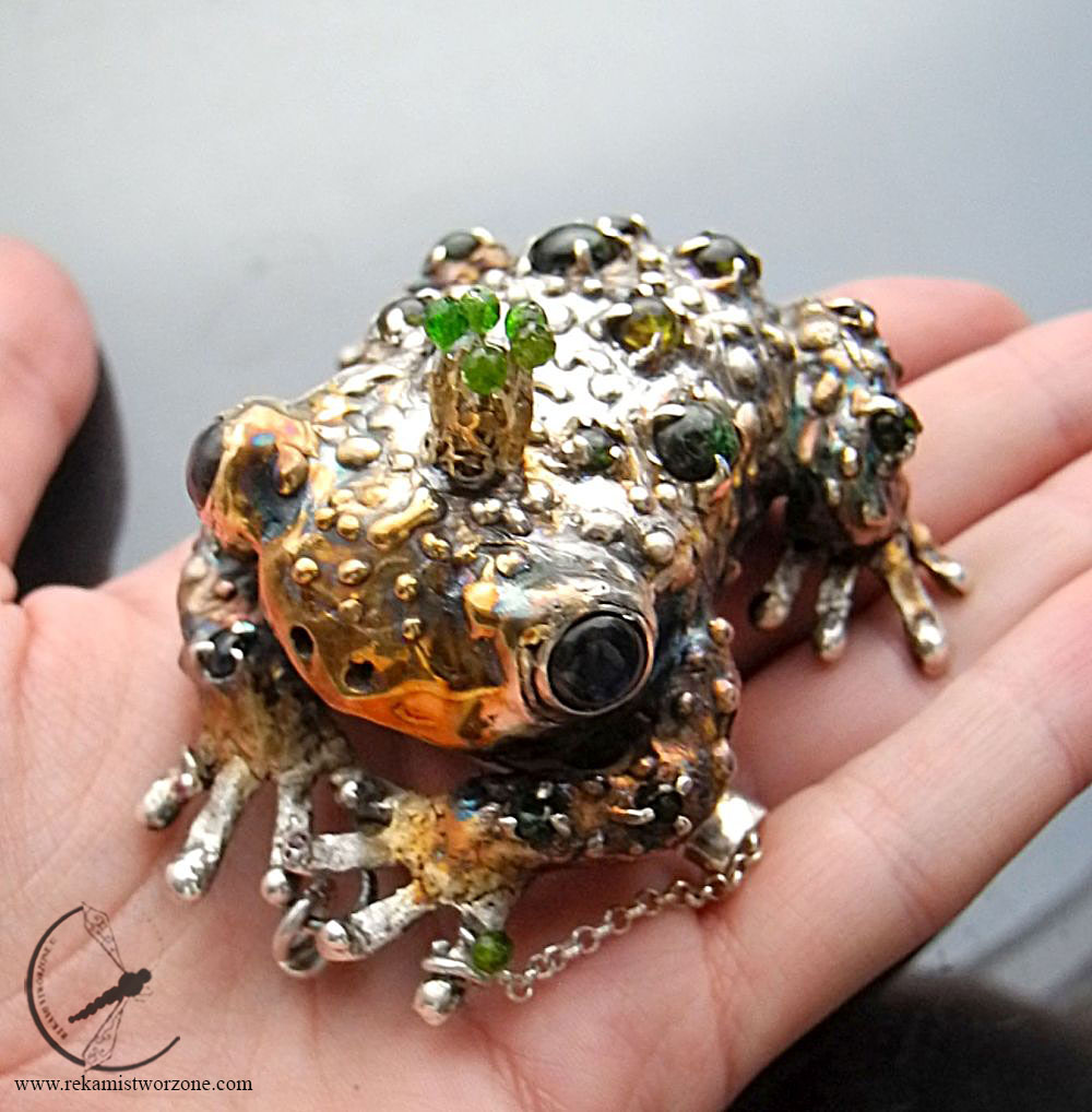 Kilka miesięcy temu zostałam poproszona o wykonanie niezwykłej pracy – wielkiej, srebrnej ropuchy o przyjaznej duszyczce i gracji księżniczki. Był to niezwykle trudny projekt – koncepcyjnie wiedziałam, co muszę zrobić. Ale rzeczywistość stawiała ciągle nowe, nieprzewidziane trudności i wymusiła na mnie wymyślenie i zastosowanie wielu trików, dzięki którym ropucha, mimo swojej wielkości, jest jednocześnie dość lekka (bo pusta w środku) ale i wystarczająco odporna, żeby służyć jako pudełeczko. Do tego jest również broszą i wisiorem (i w dodatku postawiona siedzi płasko). Do zawieszenia na szyi służy pierścionek z granatem, który Ropuszka Regina trzyma w łapkach. Oczy ropuszki pełne są żywych błysków i czarodziejskiego spojrzenia dzięki osadzieniu w nich czarnych labradorytów. Na grzbiecie osadzone są butelkowo-zielone turmaliny (14) w roli ropuszych guzów. Na głowie ma pozłacaną koronę zdobioną diopsydami. Na palcu ma pierścionek z diopsydem, a w dwóch pazurkach ma osadzone rubiny. Plecy, łapki i podgardle są diamentowane, a sama ropszuka jest barwiona tonalnie.