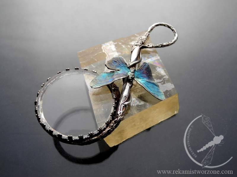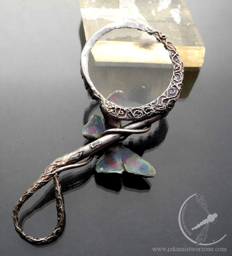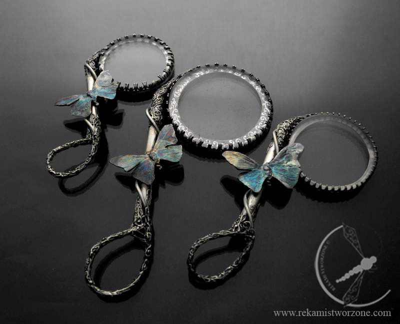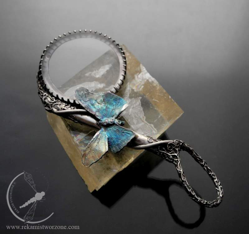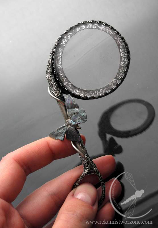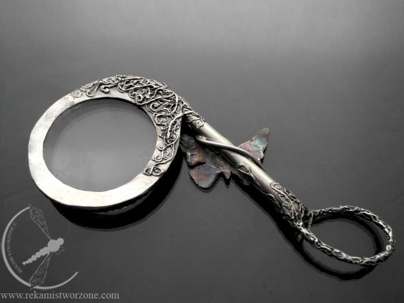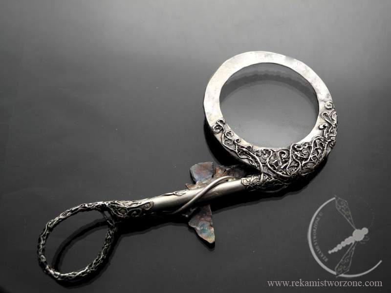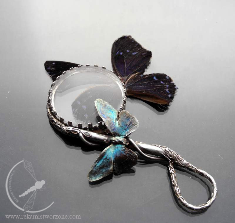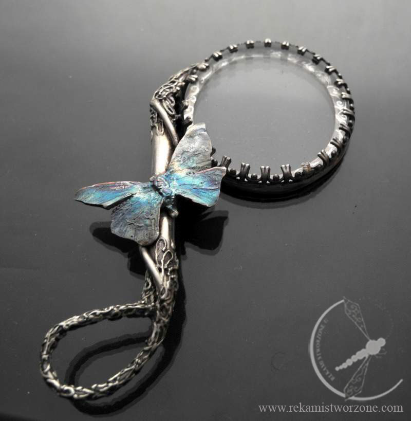 Ozdobne szkło powiększające w srebrnej oprawie z niebieskim motylem.