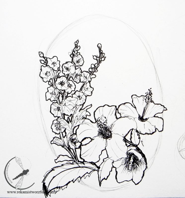 Owal zaznaczony ołówkiem oznacza docelową wielkość logo. Tekst sugeruję umieścić w wolnej przestrzeni nad kwiatami ketmii.