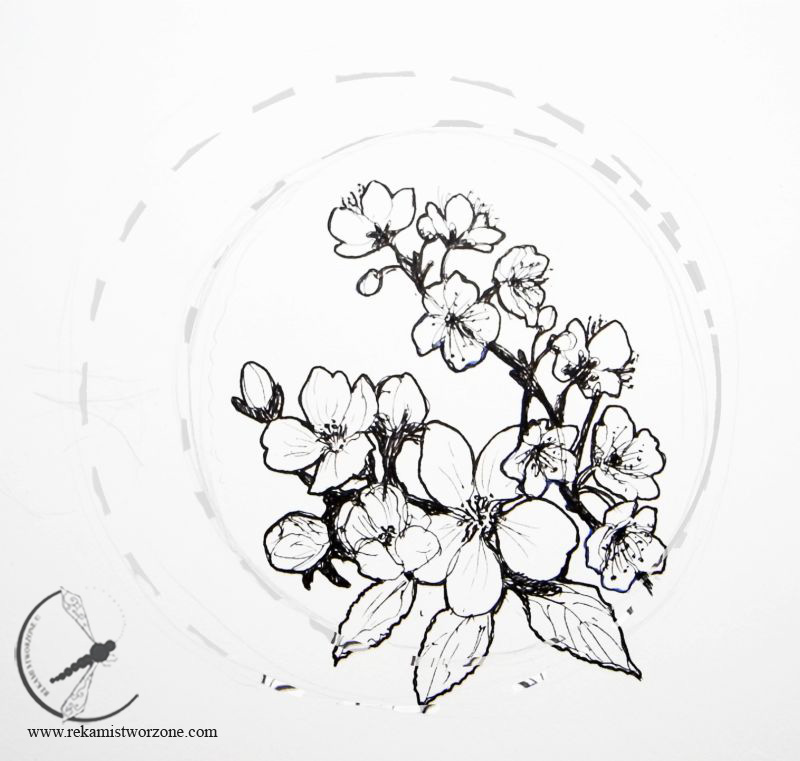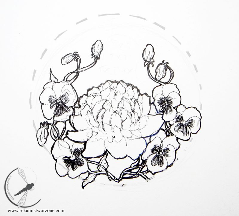 Okrąg zrobiony linią przerywaną sugeruje docelową wielkość logo. Tekst sugeruję umieścić centralnie, w wolnej przestrzeni nad kwiatem piwonii.