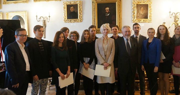 Ceremonia rozdania Stypendium Twórczego Miasta Krakowa 2014 - na zdjęciu laureaci, Prezydent Miasta Krakowa Jacek Majchrowski oraz Przewodniczący Komisji Kultury - Jerzy M. Fedorowicz